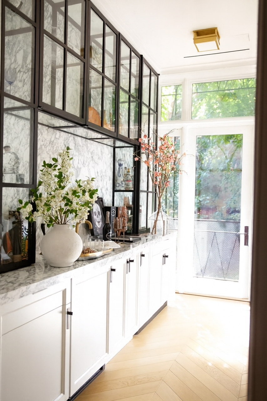 Our custom steel-framed glass cabinet doors bring timeless elegance and functionality to any kitchen or bar space. Crafted with precision and minimalist black profiles, they beautifully showcase interiors while maintaining durability and strength. Perfect for displaying fine glassware, ceramics, or décor, these doors blend industrial design with refined sophistication—creating a modern yet warm atmosphere ideal for both residential and commercial interiors.