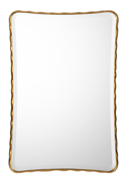 The Rolling Ridge Mirror shows off a delicate profile elevated by lavish flair. A rectangular beech wood frame in an exotic gold finish showcases curvaceous ripples that beautifully complement against the beveled mirror nestled within. This piece is installed with french cleats and can be displayed in portrait or landscape orientations.